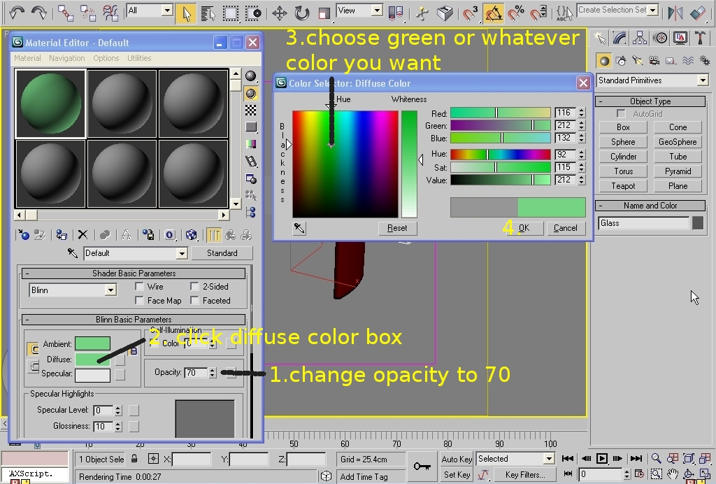 2.Go to RENDERING on menu and choose MATERIAL EDITOR or just press M for shortcut. When material editor dialog box show up, select your material slot. Change the opacity to 70. Then click on DIFFUSE COLOR box and choose GREEN or any color you want. After that click OK. See the pic below for the steps :